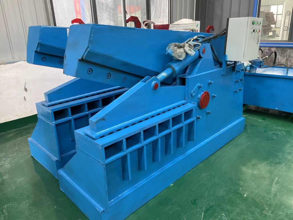 An Alligator Shear is a hydraulically driven cutting machine used primarily to cut scrap metal into smaller, uniform pieces. Its design is simple yet powerful: a fixed lower blade and a movable upper blade hinged like an alligator’s jaw. When activated, the hydraulic system drives the upper blade downward to shear through metal with immense force.