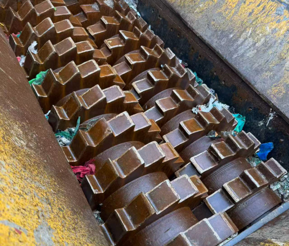 Once the material enters the shredding chamber, rotating blades begin cutting and tearing it apart.